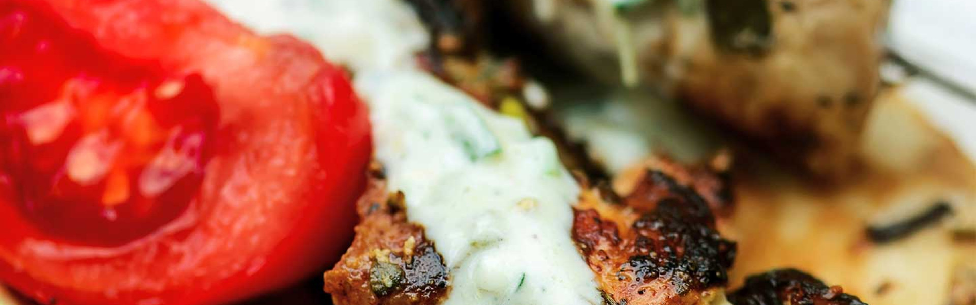 - Курку порізати невеликими шматочками. Для маринаду потовкти перець з сіллю. Часник пропустити через прес. Видавити сік з лимона, листочки материнки і чебрецю дрібно нарубати. Змішати 150 мл йогурту, гірчицю, лимонний сік, часник, материнку, сіль і перець. Відкласти 4 ст. л. маринаду і змішати його з рештою йогурта. Посолити за смаком і прибрати в холодильник, це буде соус.
