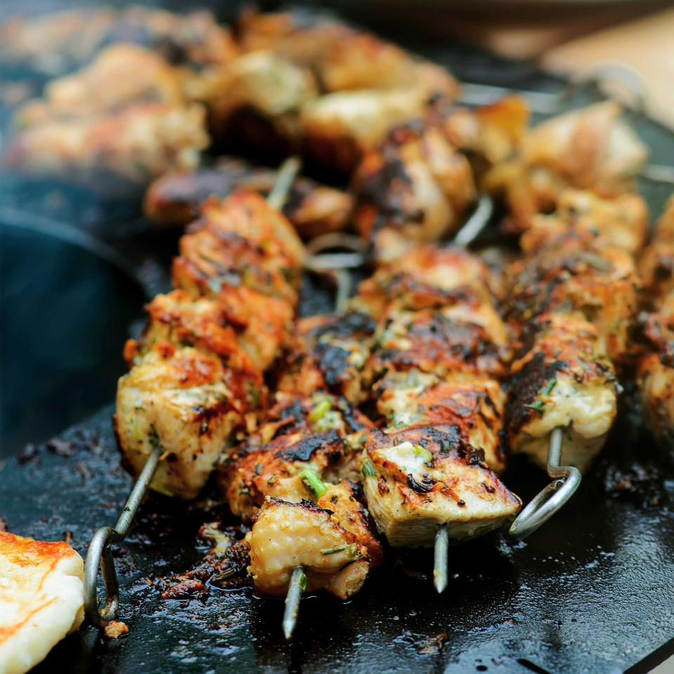 - Змішати м'ясо з маринадом в скляному контейнері і прибрати на ніч у холодильник. Мариновану курятину нанизати на шампури і готувати близько 15-20 хвилин, часто перевертаючи на поверхні гриля (гриль скропити оливковою олією).