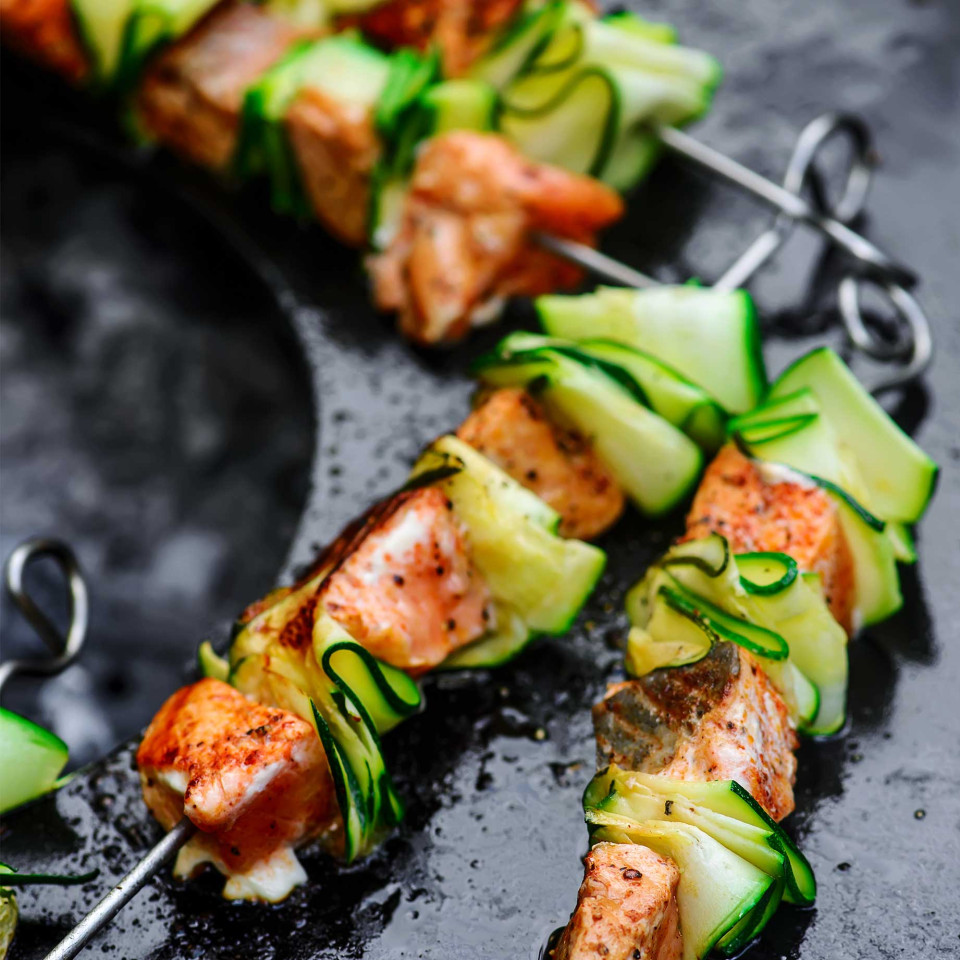 • На шпажки нанизать рыбу вперемешку с гармошками цуккини. Жарить на планче, решетке, под грилем духовки или сковороде-гриль со всех сторон по 2 минуты. Подавать немедленно с домашним майонезом и зеленым салатом.